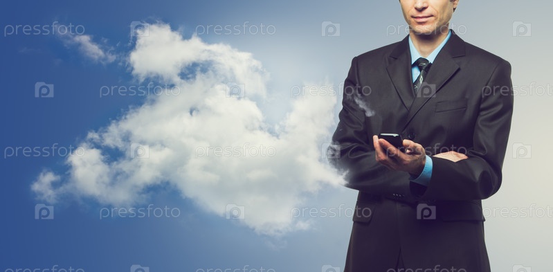 Предприниматель с мобильным телефоном в руке на фоне облачного неба