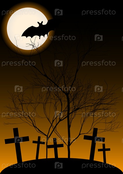 Хэллоуин. Кладбище, деревья, полная луна и летучая мышь