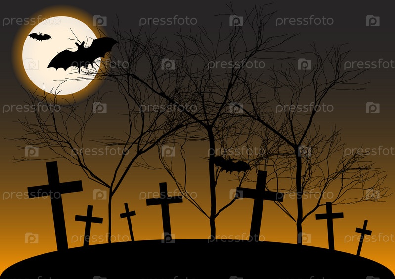 Хэллоуин. Кладбище, деревья, полная луна и летучая мышь