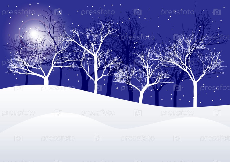 Зимний фон со снежными холмами, деревьями и ночным небом со звездами