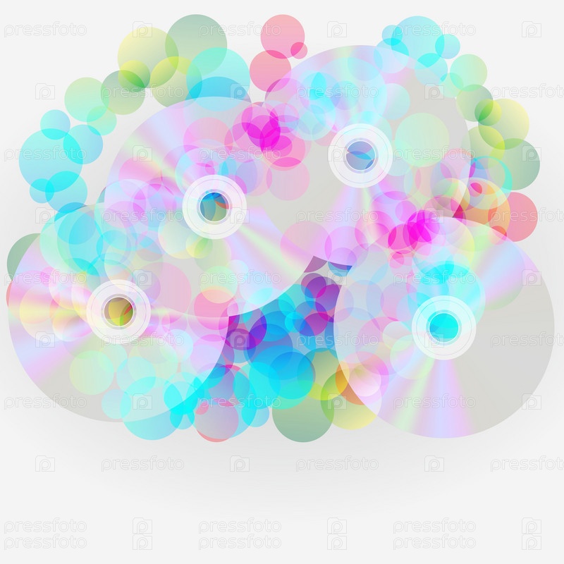 Компакт-диски и разноцветные пузыри на белом фоне