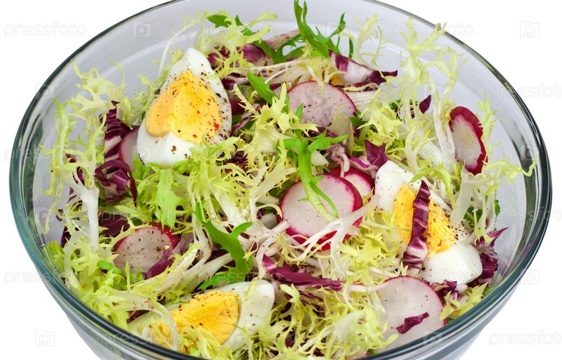 Салат с зеленью и вареными яйцами в стеклянной мисе на белом фоне