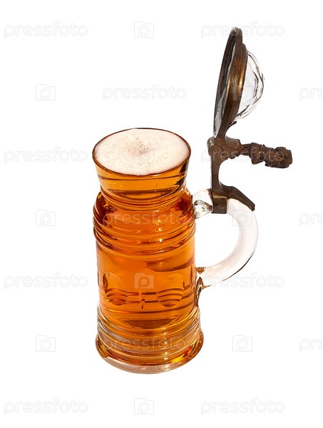 Пиво в старинной кружке на белом фоне