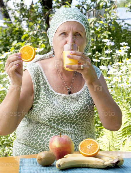Взрослая женщина кушает свежие фрукты в летнем саду