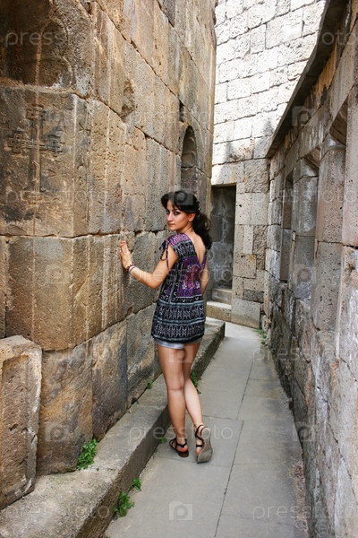 Девушка в Татевском монастыре в Армении, архитектура IX века