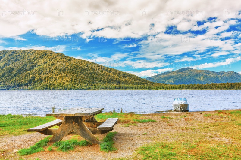 Стол для пикника на берегу озера в Новой Зеландии