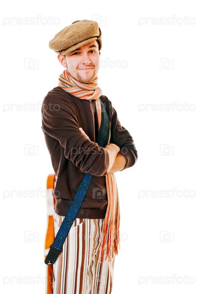 Молодой гитарист со своим инструментом, изолированный на белом