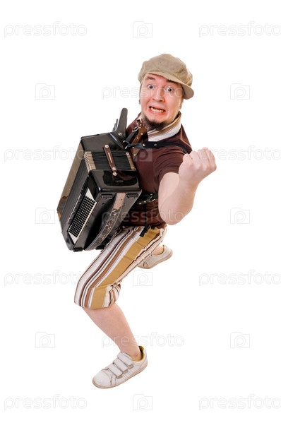Молодой музыкант с аккордеоном, изолированный на белом фоне