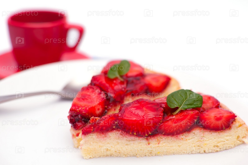 Домашний клубничный пирог с мятой и чашкой кофе в фоновом режиме