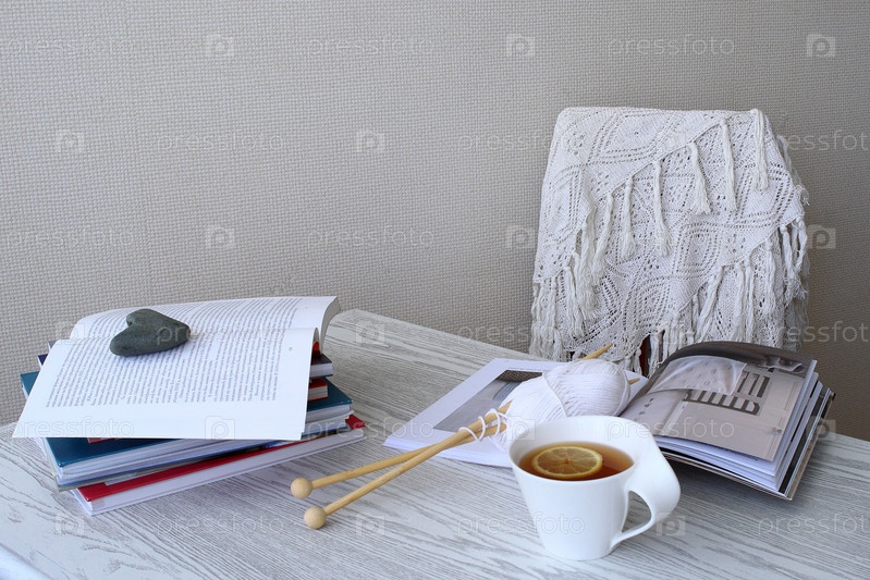 Романтический натюрморт с журналами, чашкой чая и вязанием