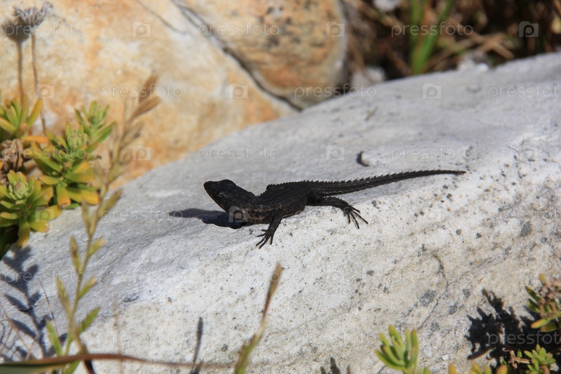 Черная ящерица греется на камне