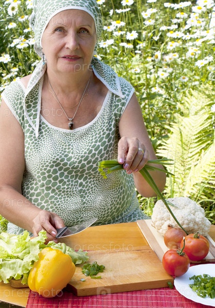 Счастливая женщина нарезает салат из свежих аппетитных овощей в зеленом летнем саду