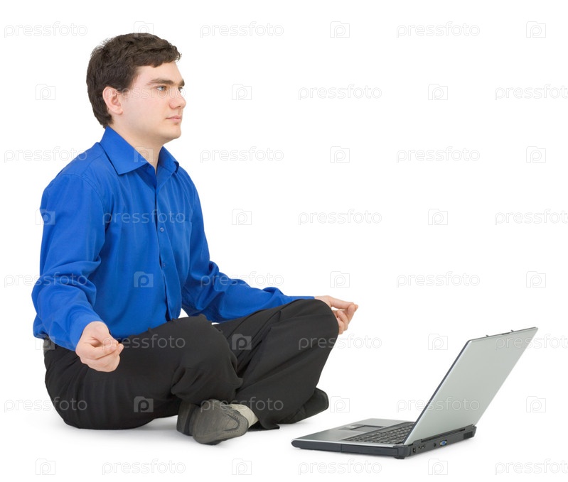Бизнесмен сидит на полу перед ноутбуком и медитирует