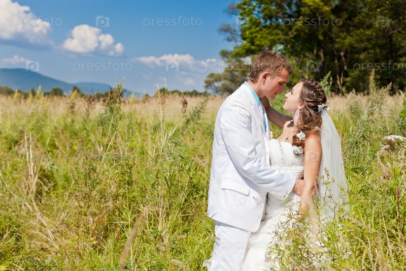 Жених и невеста обнимаются в поле