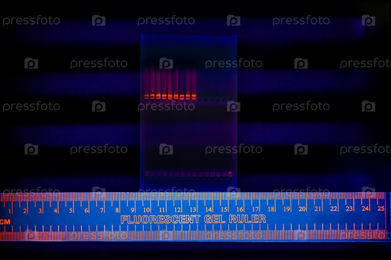 ДНК-анализ. Разделение фракций ДНК на агарозном геле с добавлением флуоресцентного красителя этидий бромида. Снято в ультрафиолетовом свете. Ядерная и митохондриальная ДНК мышечной ткани