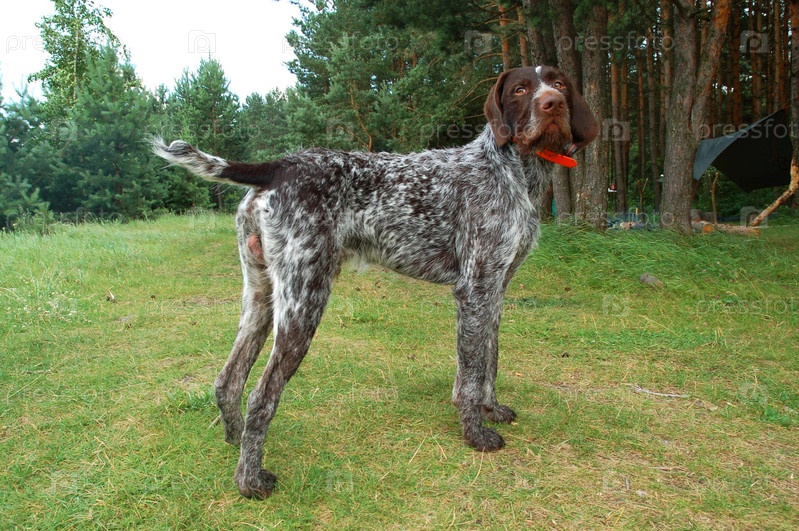 Немецкий жесткошерстный пойнтер в зеленом лесу