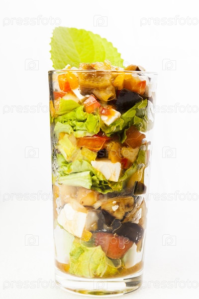 Веррин. Салат из баклаажанов, томатов, феты, сладкого перца и листев салата с листиком мяты. Изолировано на белом