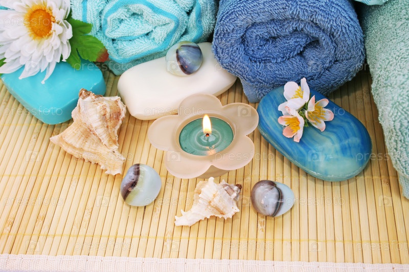 Полотенца, мыло, свечи, морские камни, цветы на фоне бамбуковой салфетки