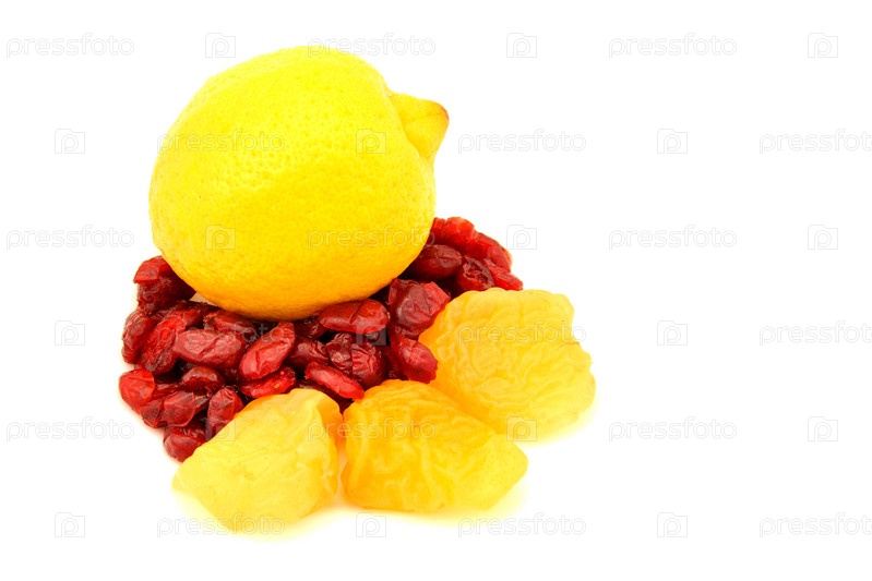 Лимон и сухофрукты на белом фоне