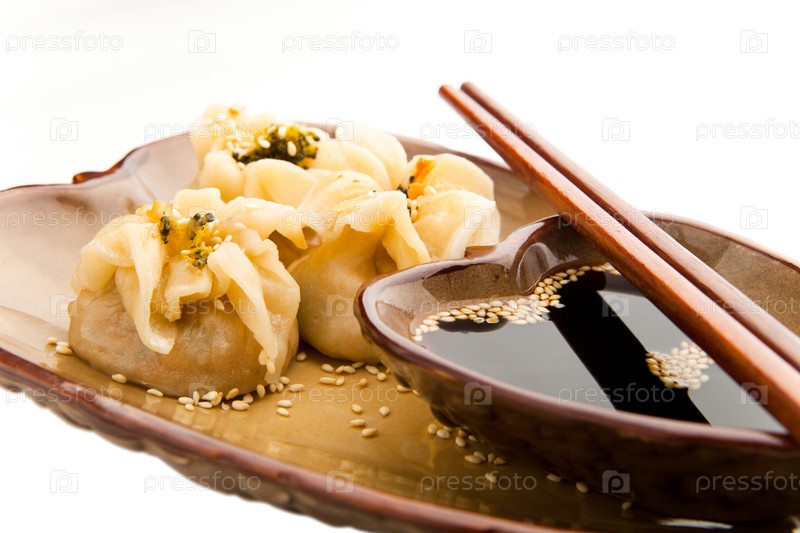 Дамплинги с брокколи, соевыми ростками и тофу. Изолировано на белом