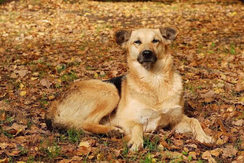 Собака отдыхает на осенней листве