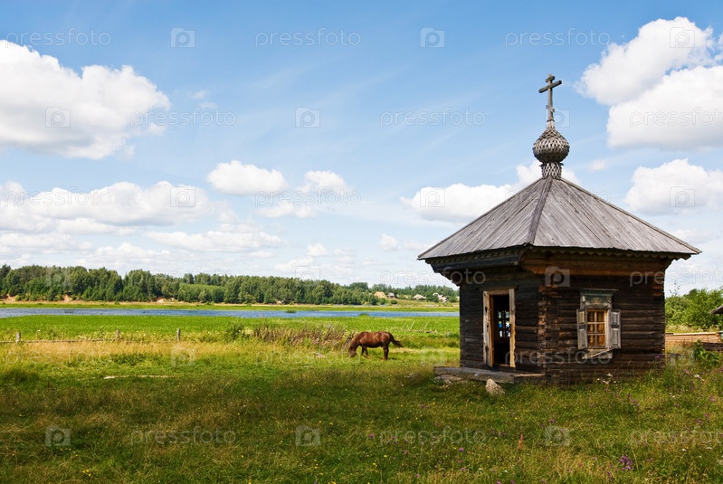 Сельский пейзаж с деревянной церковью