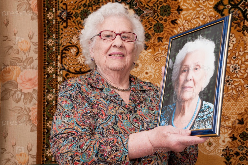 Пожилая женщина с гордостью показывает ее портрет, сделанный недавно