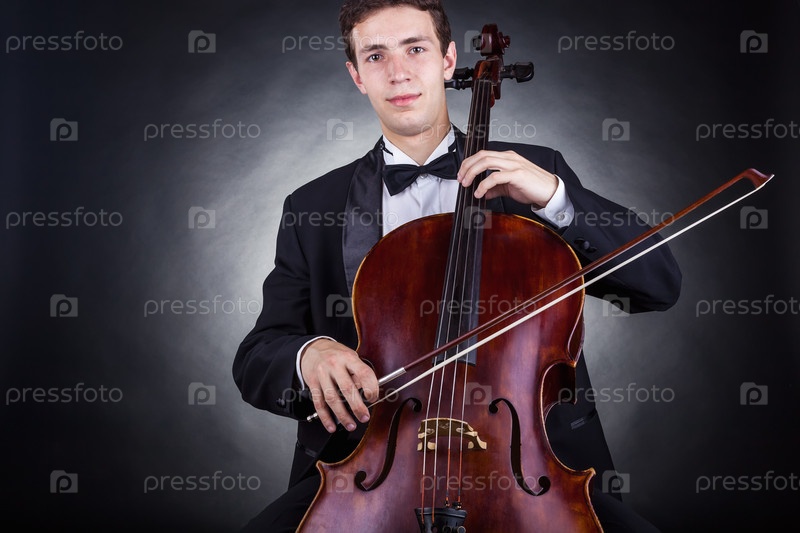 Виолончелист играет классическую музыку на виолончели на черном фоне