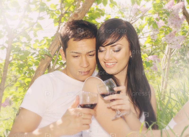 Молодая пара пьет вино под кустом сирени
