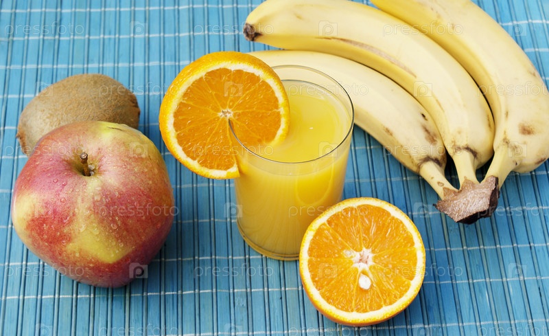 Апельсиновый сок и спелые аппетитные сочные фрукты