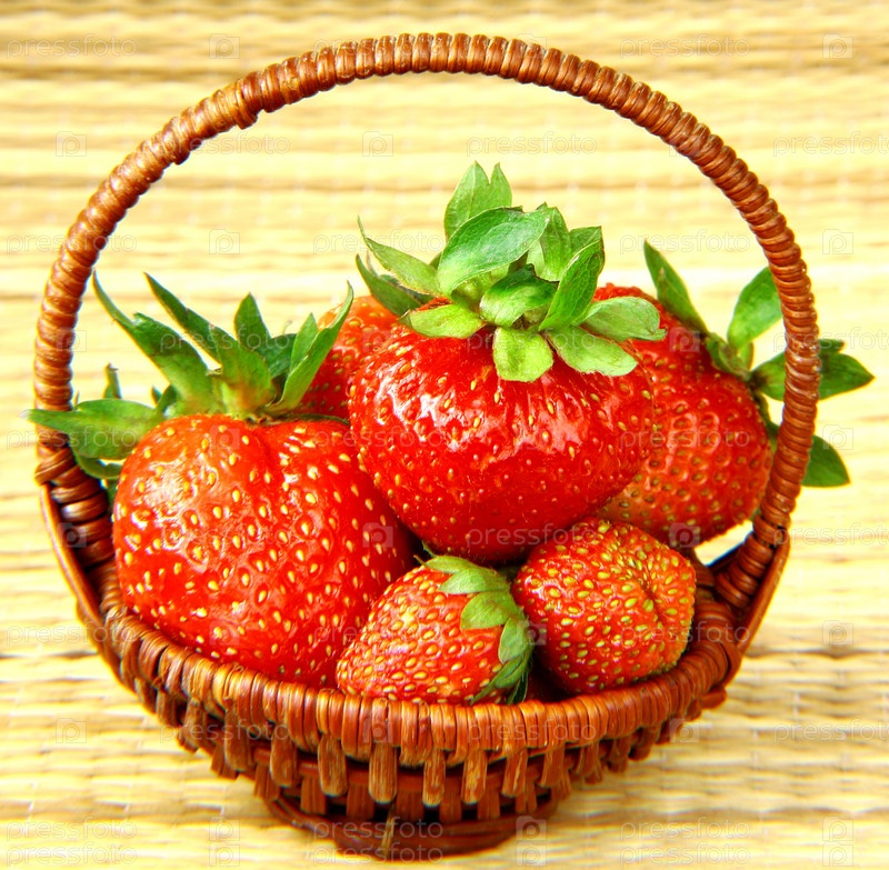 Клубника в небольшой бамбуковой корзине в солнечном свете