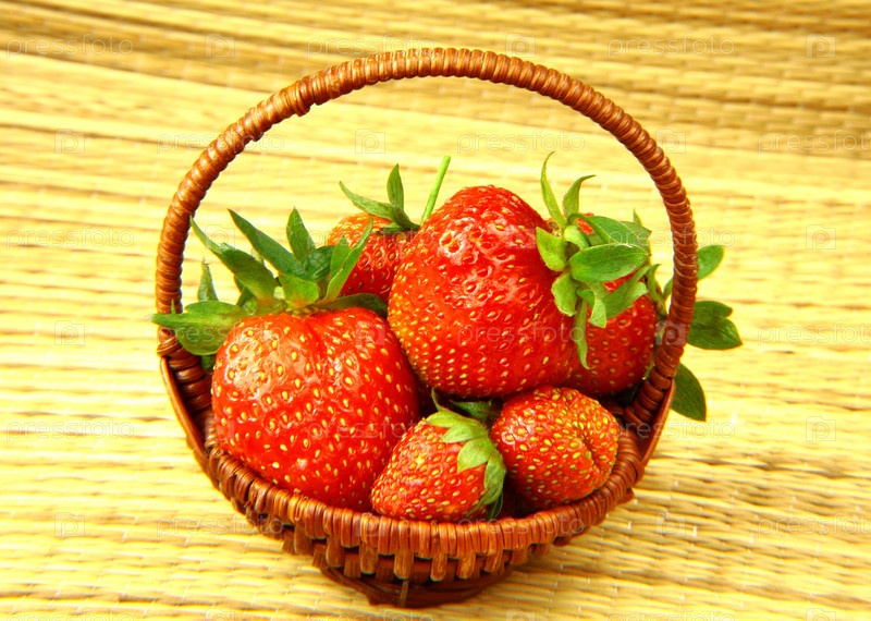 Клубника в небольшой бамбуковой корзине в солнечном свете