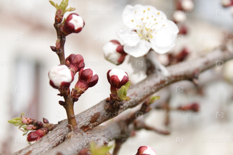 Распускающиеся белые цветы на абрикосовой ветке