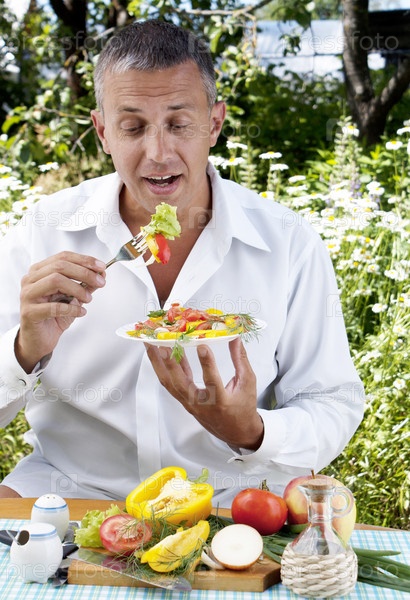 Мужчина-вегетарианец дегустирует салат из свежих аппетитных овощей