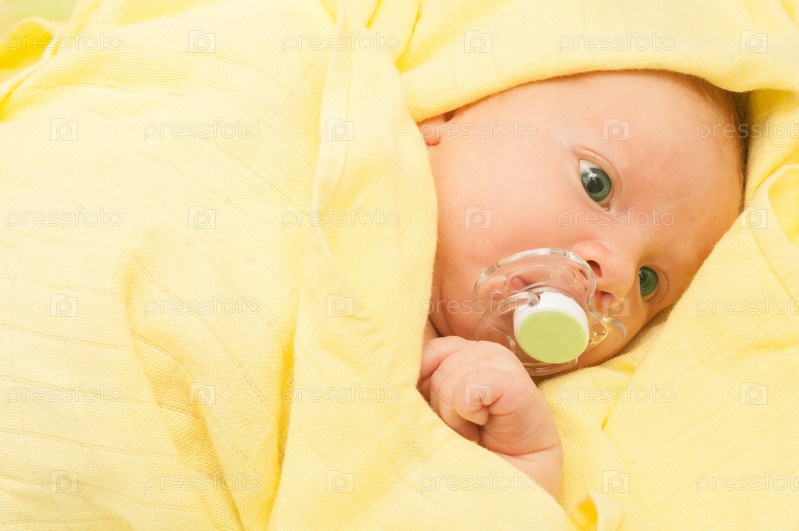 Новорожденный с соской во рту на желтом одеяле в постели