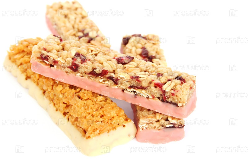 Зерновые батончики с белым шоколадом, изолированные на белом фоне