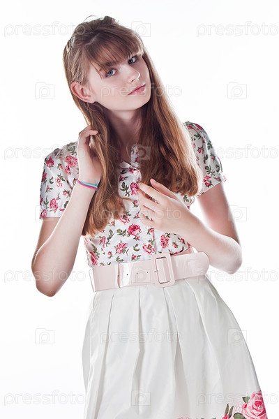 Молодая и красивая женщина в элегантной одежде изолирована на белом фоне