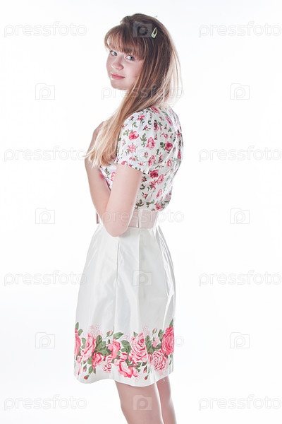 Молодая и красивая женщина в элегантной одежде изолирована на белом фоне