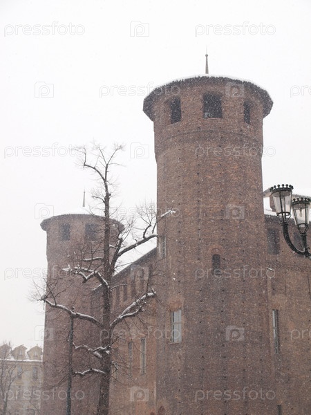 Королевский дворец Палаццо Мадама в Пьяцца Кастелло, Турин, Италия. Зимний вид со снегом