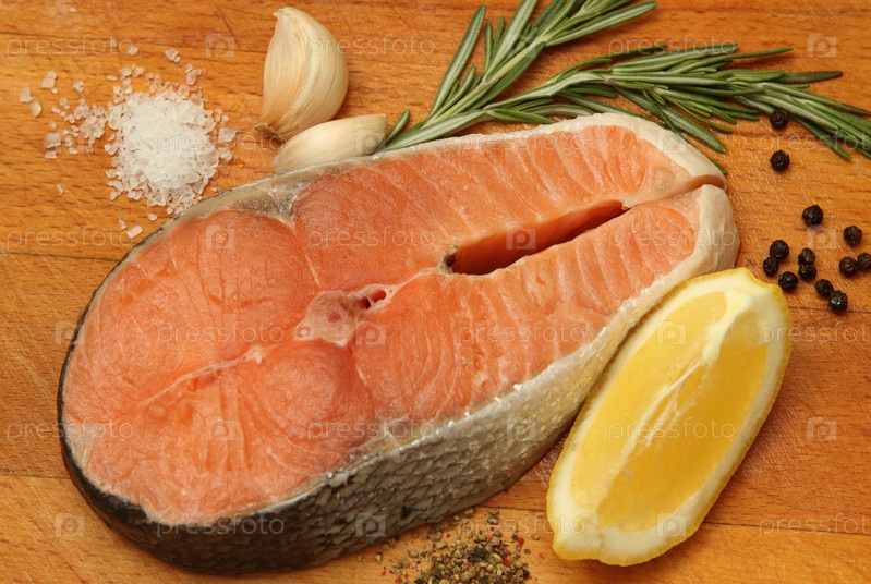 Лососевый стейк и кулинарные ингредиенты на столе