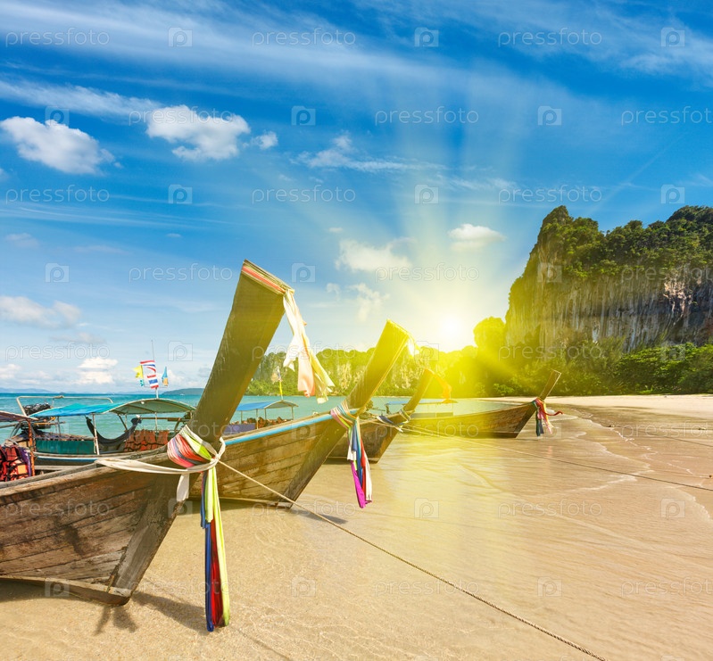 Длинные лодки на тропическом пляже на закате
