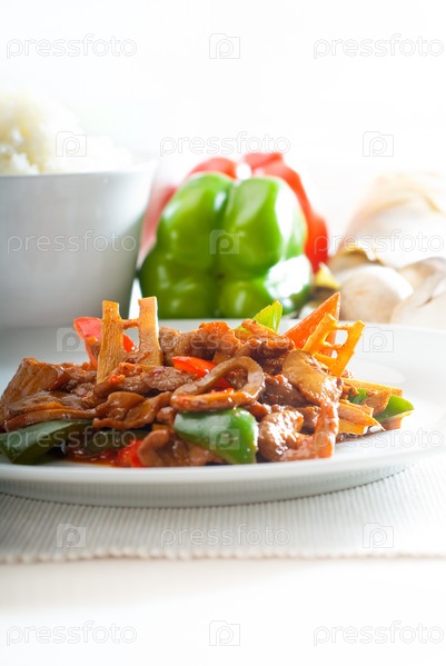 Типичное китайское блюдо из свежей говядины, обжаренной с перцем, ростками бамбука и грибами