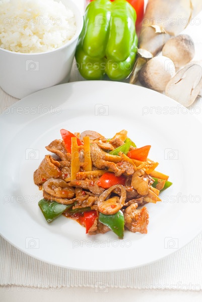 Типичное китайское блюдо из свежей говядины, обжаренной с перцем, ростками бамбука и грибами