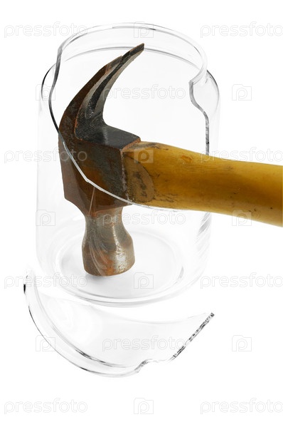 Разбитый стеклянный кувшин и молоток изолированные на белом фоне