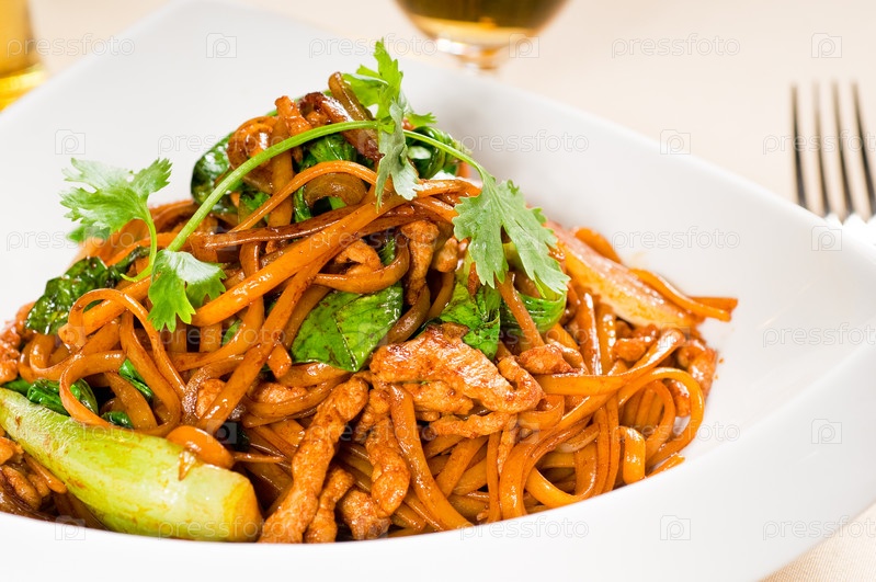 Классическая свежая китайская жареная лапша со свининой, овощами и кориандром