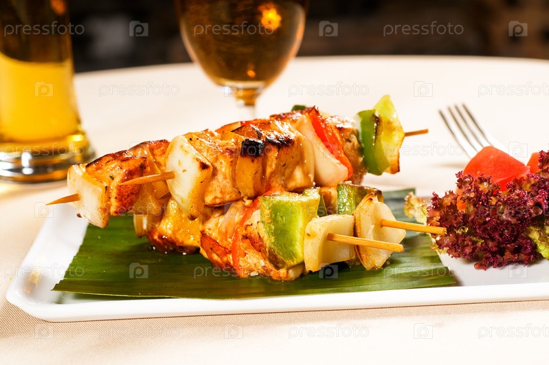 Свежий шашлык из курицы с овощами на пальмовых листьях по-тайски