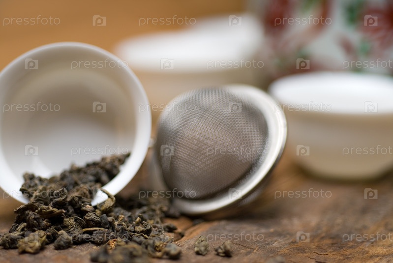 Сухой зеленый китайский чай с ситечком, чашками и чайником крупным планом на деревянной доске