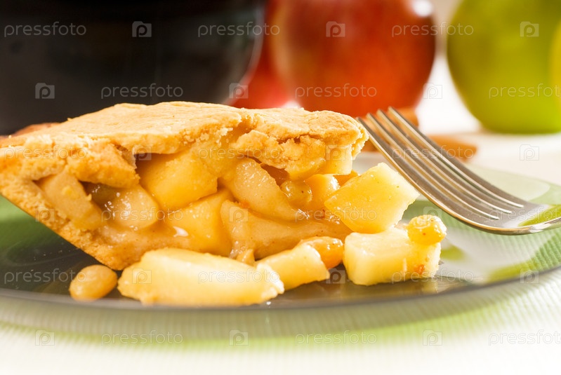 Свежий домашний яблочный пирог на зеленой стеклянной тарелке с вилкой