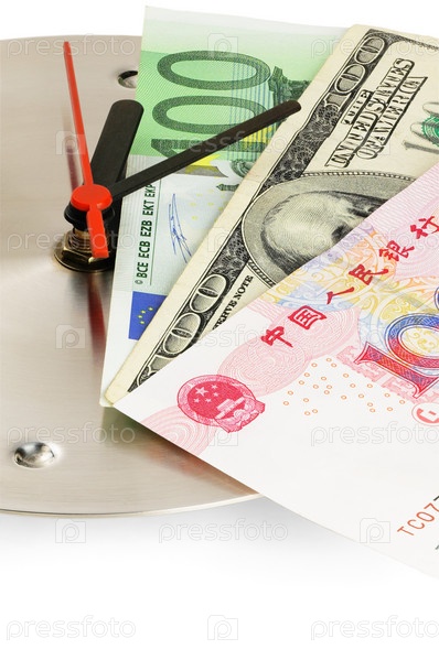 Деньги на настенных часах на белом фоне