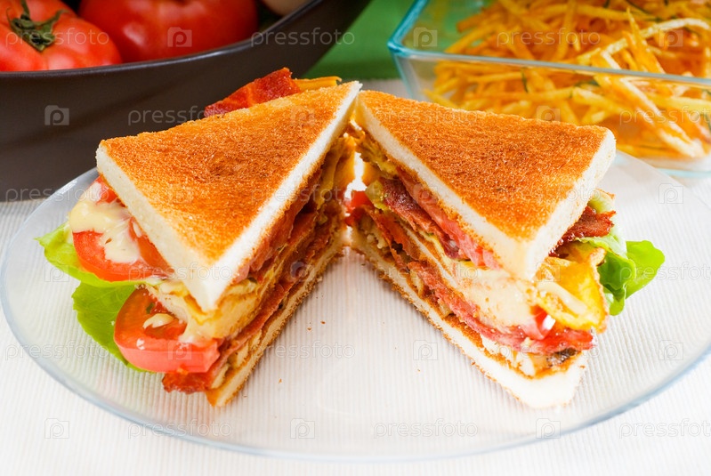 Свежий вкусный классический клубный сэндвич на прозрачном стеклянном блюде